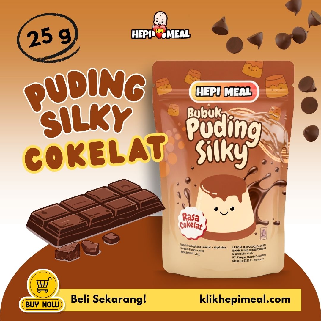 Puding silky rasa cokelat dari Hepi Meal kini hadir dalam kemasan standing pouch 25 gram yang praktis, higienis, dan mudah disajikan!